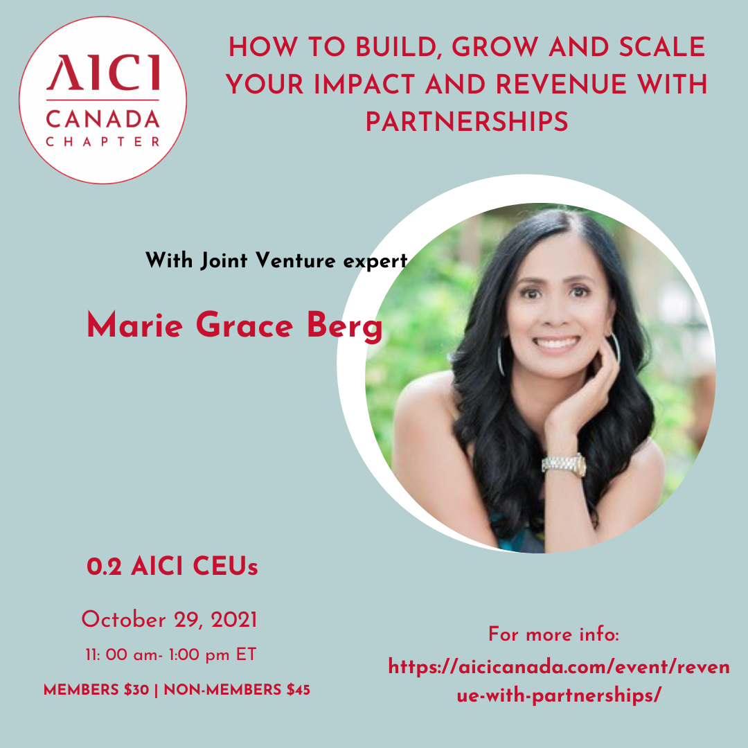 FeaturedHow To Build, Grow and Scale Your Impact and Revenue with Partnerships November 12, 2021 11:00 am - 1:00 pm ET In this 2 hour session, you will learn everything you need to know on how to build, grow and scale your image consulting business using strategic partnerships. Members $30 | Non-members $45 Topics covered will include: The mindset of collaboration and joint venture partnerships The 4 Phases of a successful joint venture partnerships How to sell affiliate products and services and earn commissions Examples of joint venture partnerships from B2B to B2C By the end of this session you will be able to: Outline the mindset of collaboration and joint venture partnerships List the basic principles and strategies for implementing a profitable win-win-win partnerships Identify your direct and indirect competitors and strategies to turn them into partnerships About Marie Grace Berg Marie Grace Berg is a business strategist and a lifestyle entrepreneur whose expertise lies in helping authors, speakers, coaches, consultants and online marketers use joint ventures to build, grow and scale their business to six-7figures and beyond. She’s been featured on major publications like Huffington Post and Entrepreneur as expert on growing your brand through collaboration with other experts. Marie and her clients have generated tens of thousands of email subscribers and multiple 6 figures in revenue using joint venture partnerships and expert collaborations. She’s a 20-year veteran ER nurse who has traveled all 7 continents, including Antartica, and now lives in two countries - Norway and San Francisco, California, USA, with their new toddler twins. Connect with Marie and see how she can help grow your business without spending a dime on advertising. www.MarieGraceBerg.com Reviews "I knew that JV Promotions was the best way to grow my business." Marie helped me to make it happen. She coached