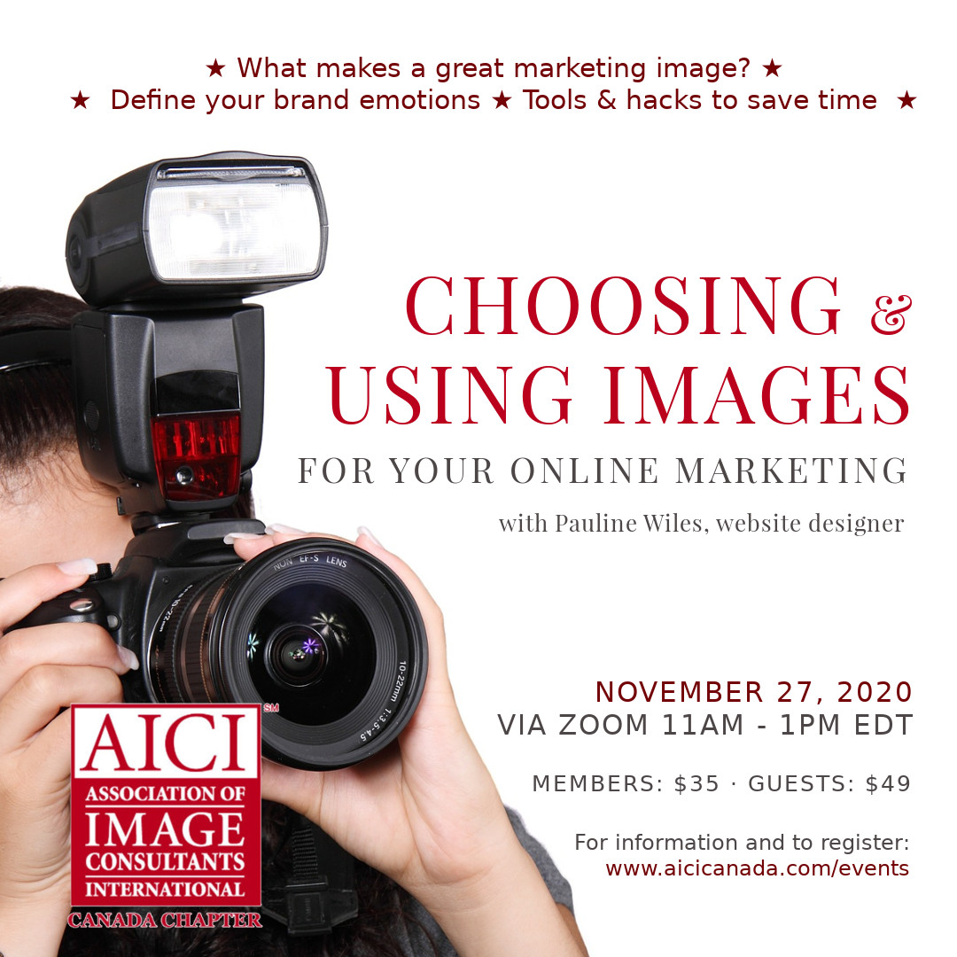 FeaturedPlease join us for Choosing and Using Images for Your Online Marketing on Zoom November 27, 2020 - 11:00 am - 1:00 pm Earn 0.2 AICI CEUs This event will be recorded, so you can take advantage from any time zone! You will be able to: Define your target market and the brand emotions you are aiming to evoke. Identify where in your promotional materials you plan to share images. Compare the attributes of a powerful marketing graphic and discuss why some images might be suitable for some purposes but not others. Analyze key technical considerations for photos in order to optimize print quality, screen load times, social media reach, and Search Engine Optimization (SEO). Practice using at least one tool to produce a high-impact image for your own promotions. Members: $35 | Guests: $49 | Scroll down to get your ticket! With Pauline Wiles, Website Designer Pauline Wiles is a website designer who helps solo entrepreneurs create an online home they’ll love. She coaches her clients towards websites that are low on clutter and high on impact... and she enjoys dispelling the myths around how difficult a web project should be. British by birth, Pauline is now a contented resident of California, although she admits to an occasional yearning for afternoon tea and historic houses. To Receive CEUs from this Event, you must: Attend the two-hour webinar in its entirety. Attendance will be monitored. Complete and submit the Training Evaluation by November 29th; this will be emailed to each participant. About CEUs As an authorized CEU Provider, AICI is in the process of approving this program for 0.2 AICI CEUs. Earning CEUs is not a requirement of general membership with AICI. However, if you are currently certified through AICI with CIC, CIP or CIM then you must earn CEUs